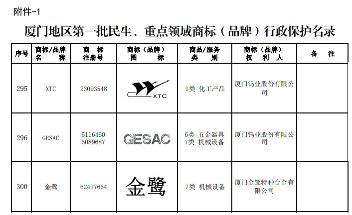 近日,厦门市市场监督管理局(知识产权局)公布了厦门地区第一批民生热点、重点领域商标(品牌)行政保护名录。厦门金鹭商标凭借卓越的品牌价值、广泛的市场认可度和强大的法律保护工作举措,成功脱颖而出,成为此次名录中的一员。其中,厦门金鹭自主所有及厦钨授权使用的品牌商标共三件商标上榜。