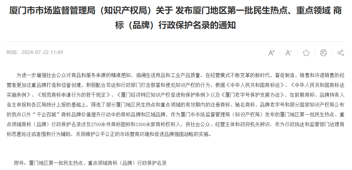 据悉,厦门市市监局公布此次保护名录,主要目的为制止与打击商标侵权假冒行为,推进商标品牌建设,健全商标品牌保护链,提高商标监管与行政执法效能。对于名录中的商标要求为在市场具有一定的知名度、有商业效益且容易被侵权的商标。