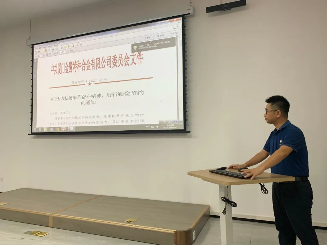 首先,由纪检委员柯福墨同志带领大家学习公司文件《厦金党群〔2022〕28号-关于大力弘扬艰苦奋斗精神,厉行勤俭节约的通知》,他希望大家能够将艰苦奋斗精神落实到工作和生活中的每一件小事上,共同努力成就勤俭节约的良好环境。